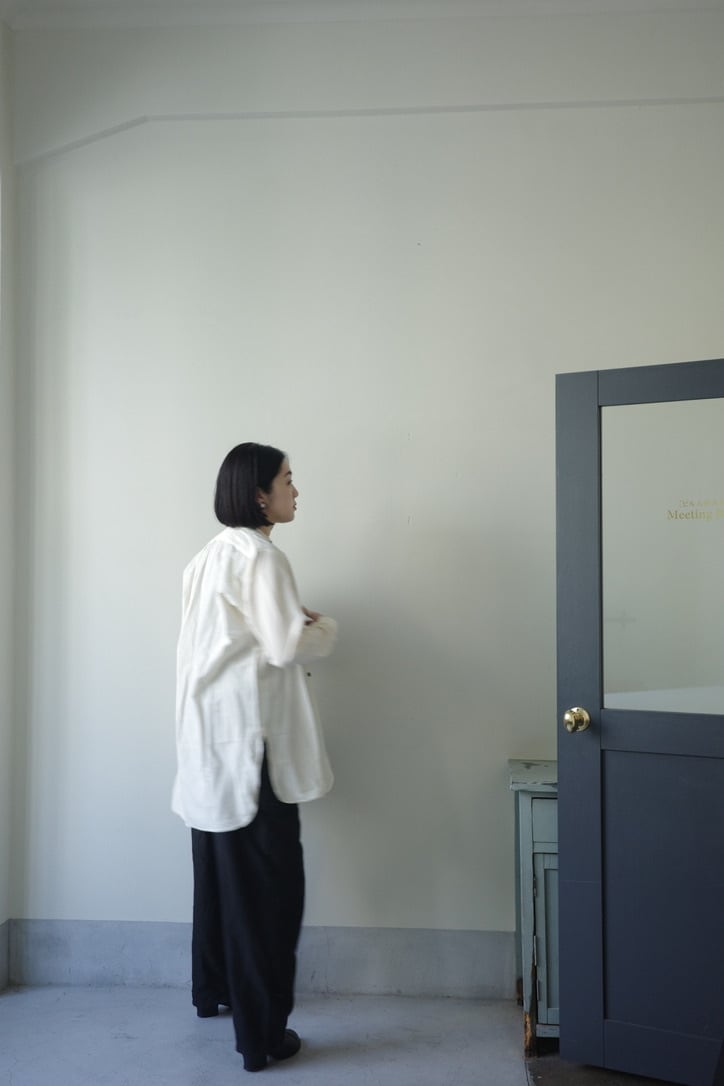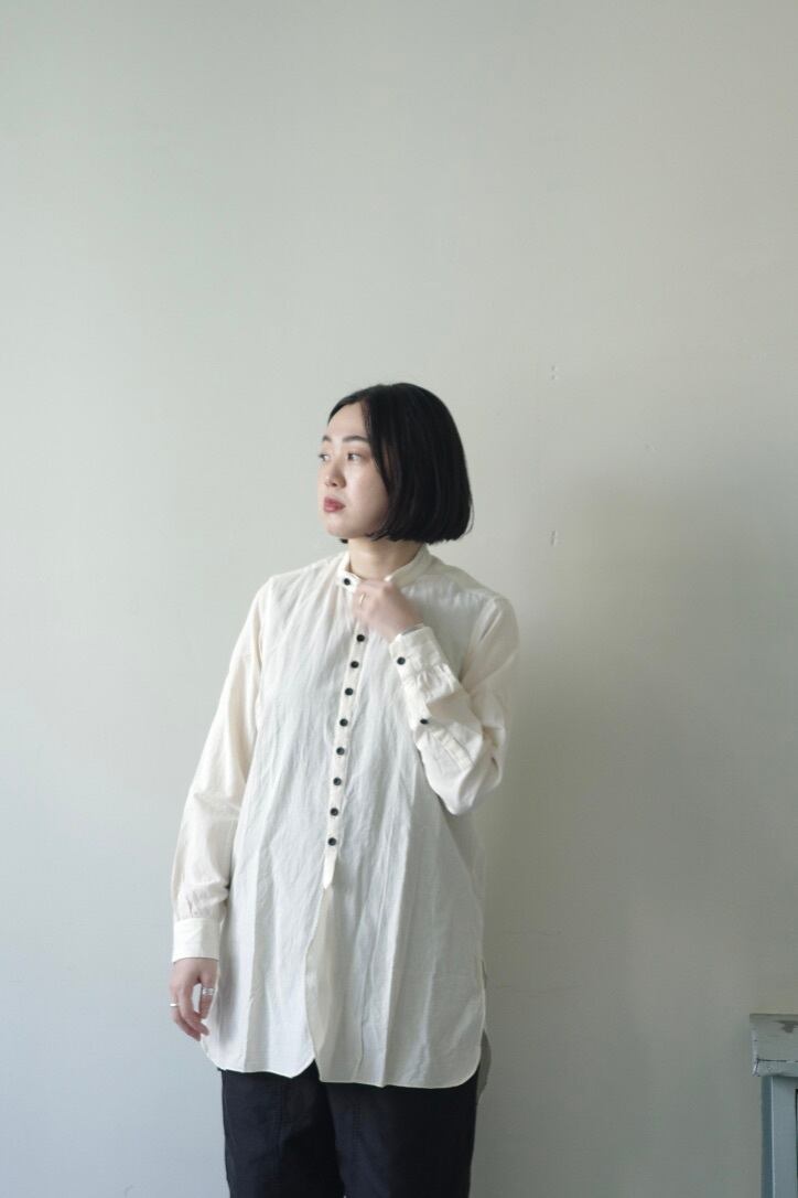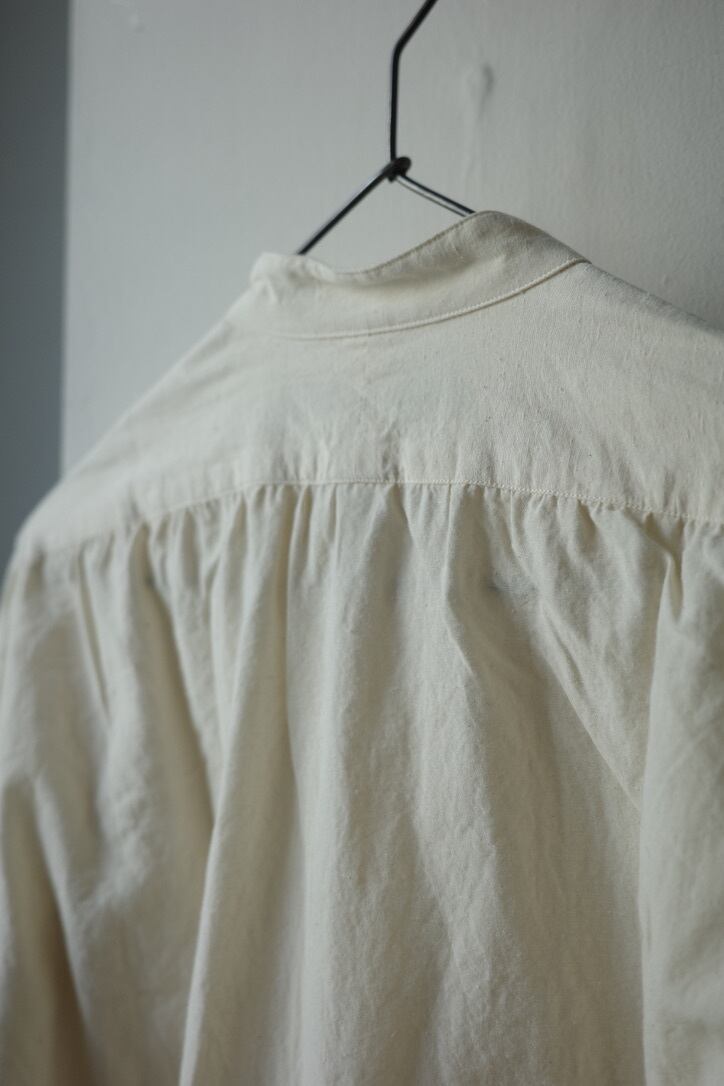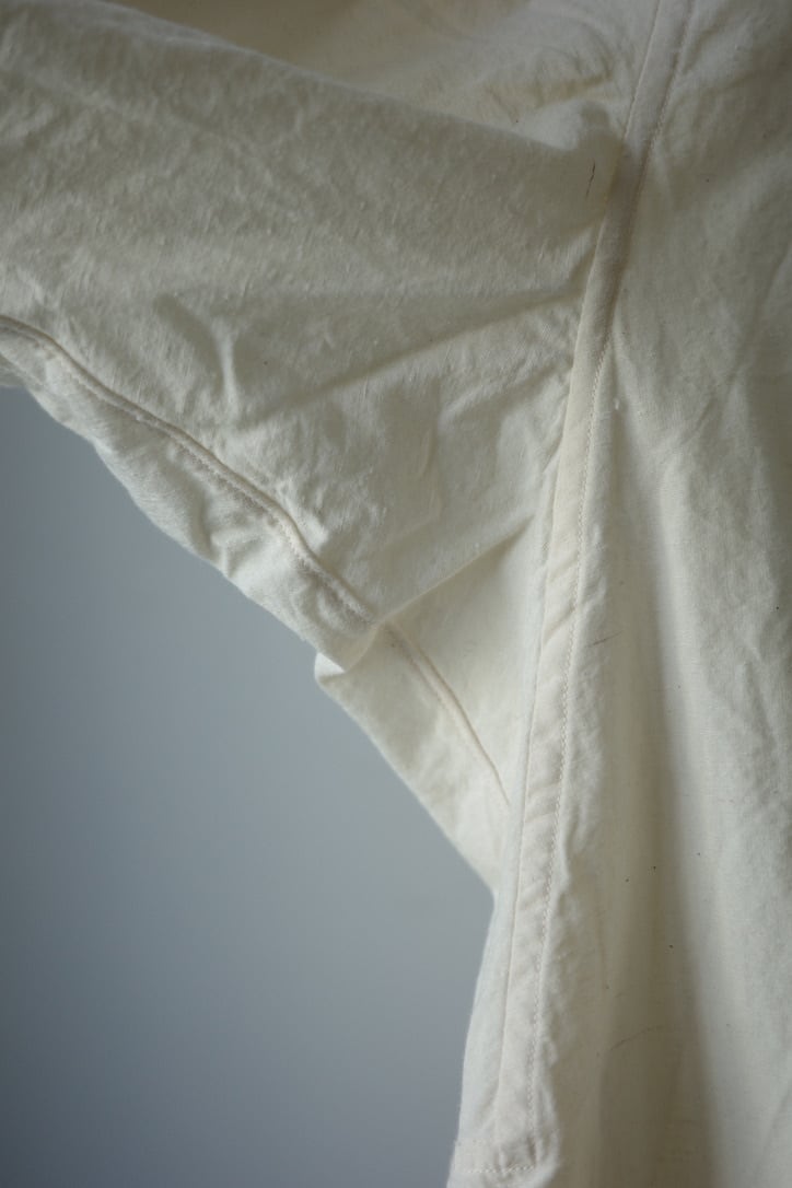 素材は経糸と緯糸に異なる無染色のコットンを用いて織り上げたコットンタイプライター。非常に柔らかくタイプライターとは思えない仕上がりです。ネップ感や節が見える、素材そのものの風合いを生かした織りは美しく、表情がとても豊か。