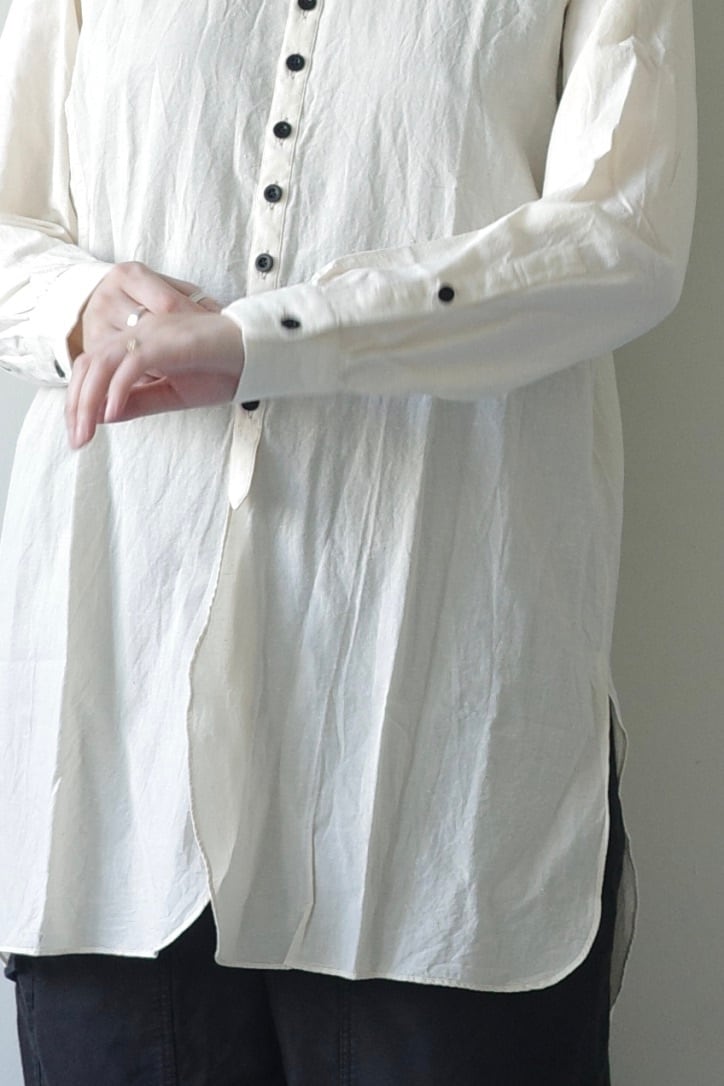 40年代の古いドレスシャツをKLASICAらしく調理したロングセラーの1枚。一見プルオーバーにも見えるボタンの配置、サイドに深く入ったスリットなど拘りのディティールです。また、ワークジャケットのアームホールのパターンをデザインに取り入れることで、ドレスシャツでありながら適度にゆとりのある作りに。こういったディテールをうまくミックスさせ仕上げるのはKLASICAならでは。