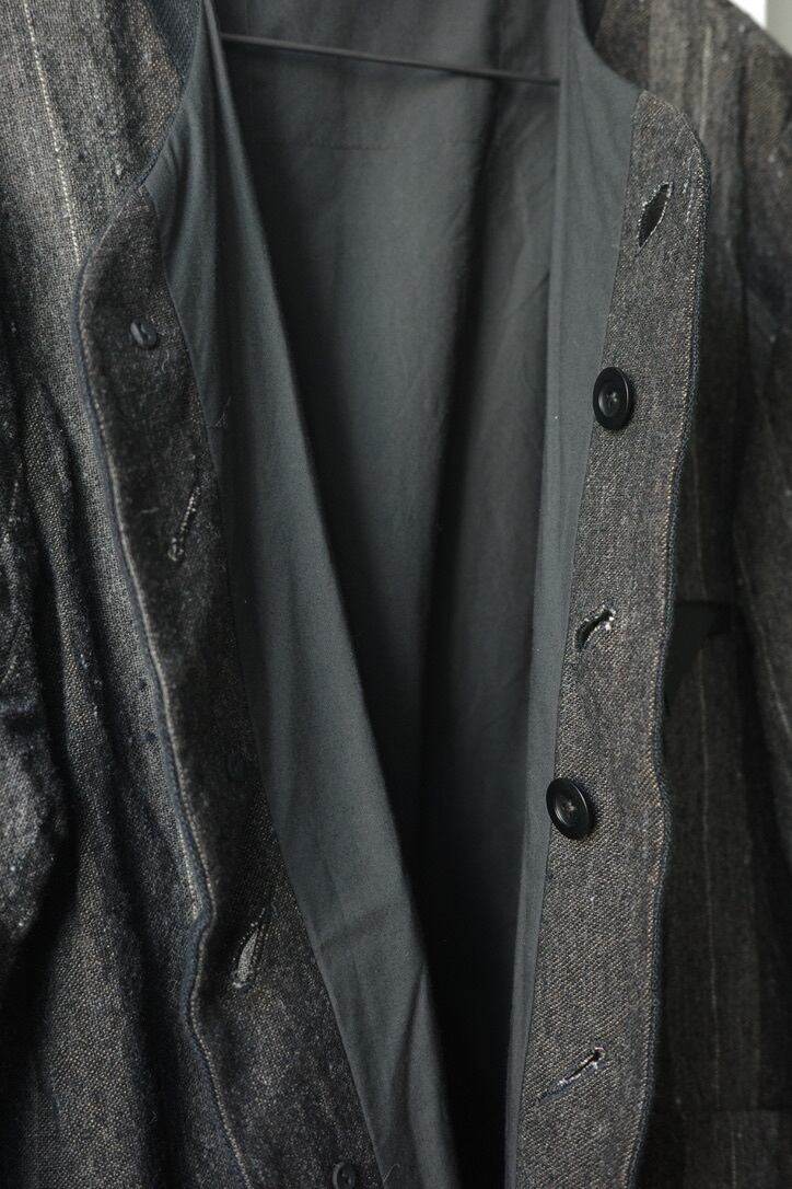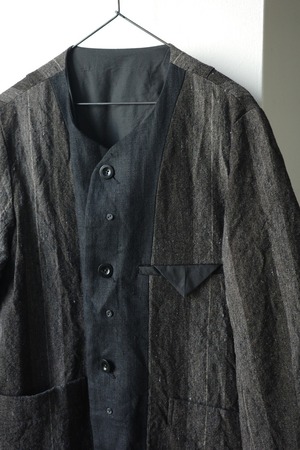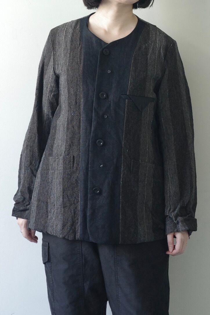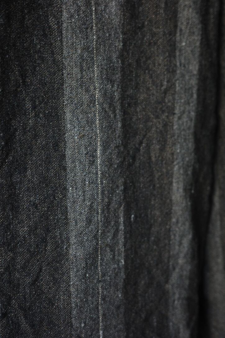 経糸には太細長短の繊維を撚り合わせたホームスパン調のブリティッシュウール糸を、緯糸にはハリの強いリネンの太番糸を用いたストライプのツイード素材を使用しています。ツイード素材のざっくりとした質感と、色の褪せた色調が特徴的な生地です。