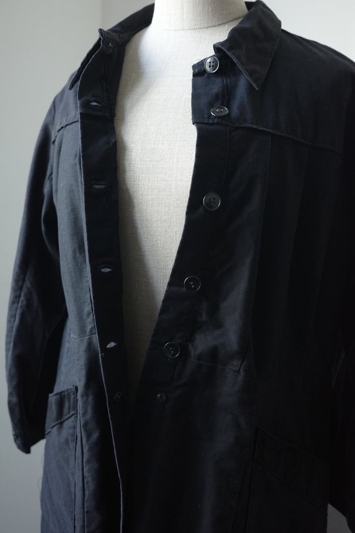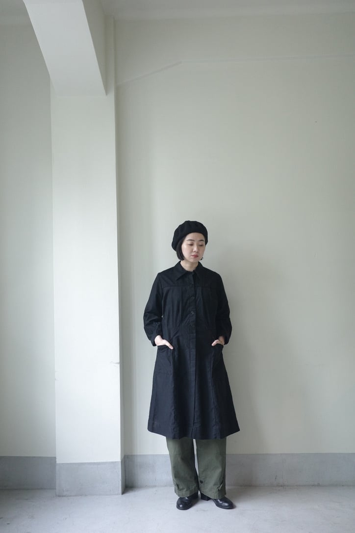 すぽっとかぶるプルオーバータイプのワークドレス。前あきを被りに当時お直しされたと思うのですが、そういったところも含め魅力に感じます。胸元に大きなタックが入るデザイン。大きなポケット、全体的なバランスがちょっぴり男前。ガシッとした生地感も相まってハンサムな印象です。
