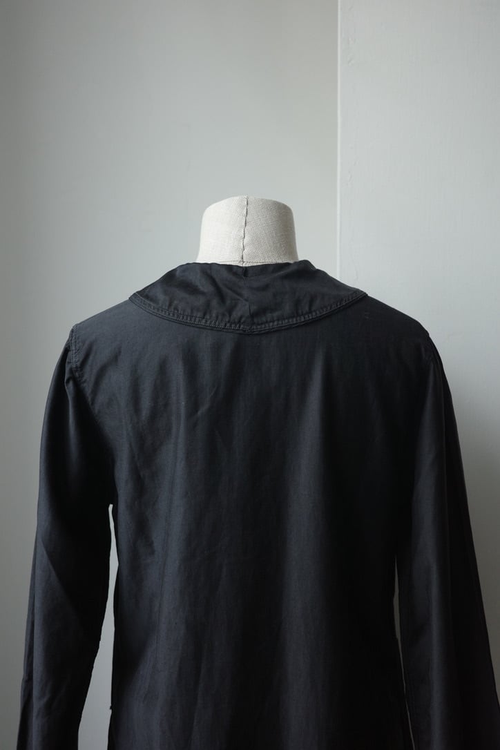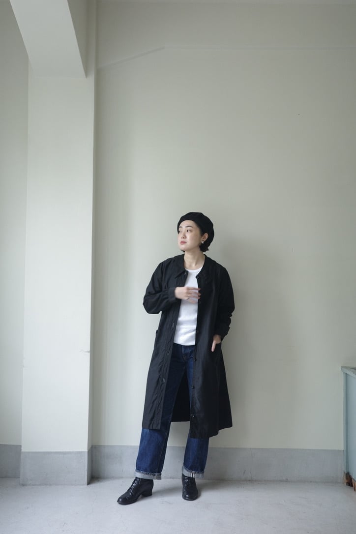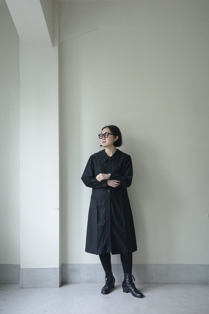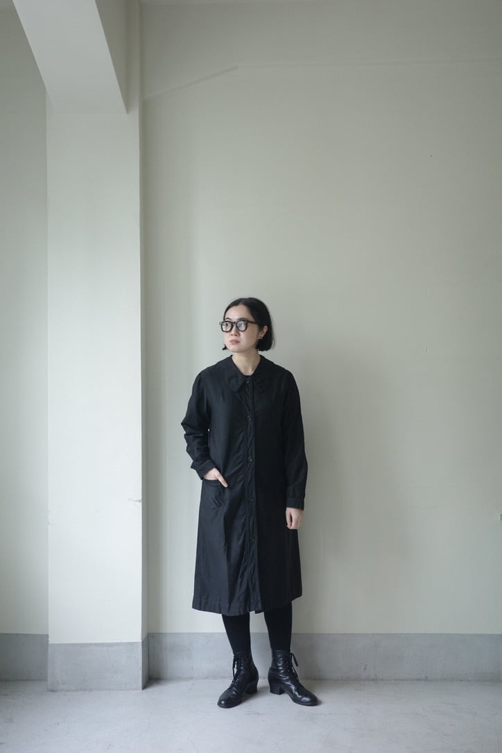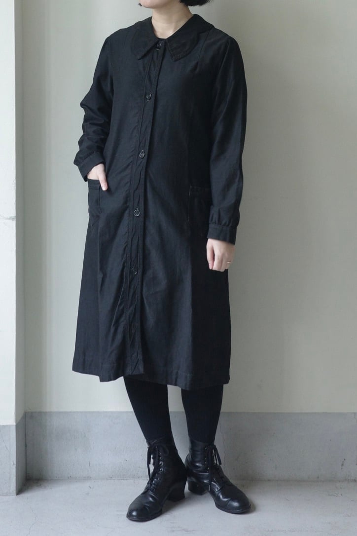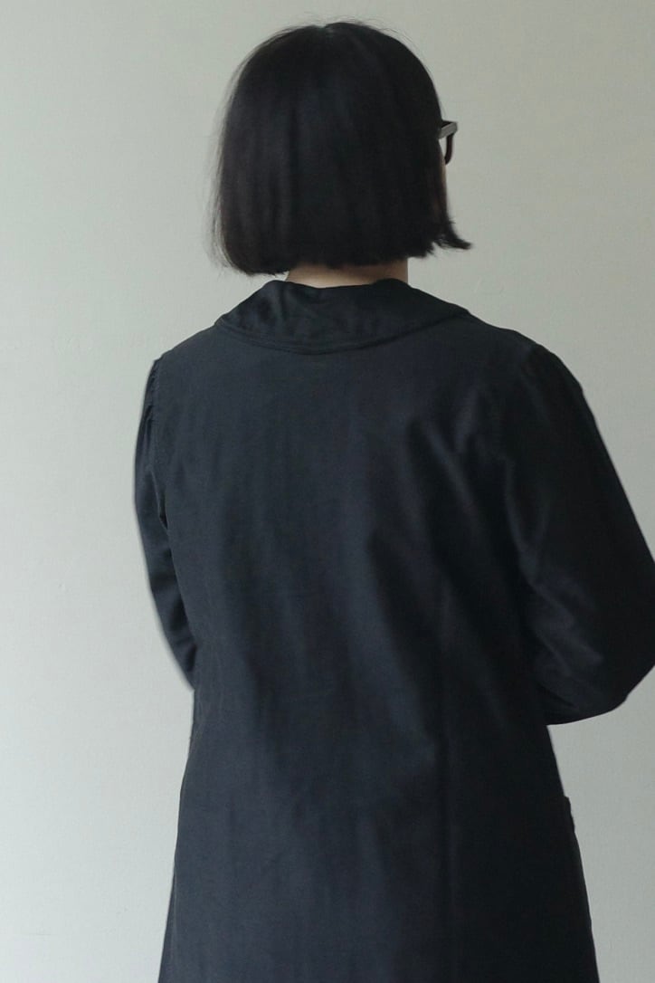 大きな襟がヴィンテージらしいワークドレス。個人的に後ろ姿がセーラーの襟のように見えるのが好きな点。ウエストにシェイプがなくストンと縦長なラインが大人っぽく綺麗なシルエットです。