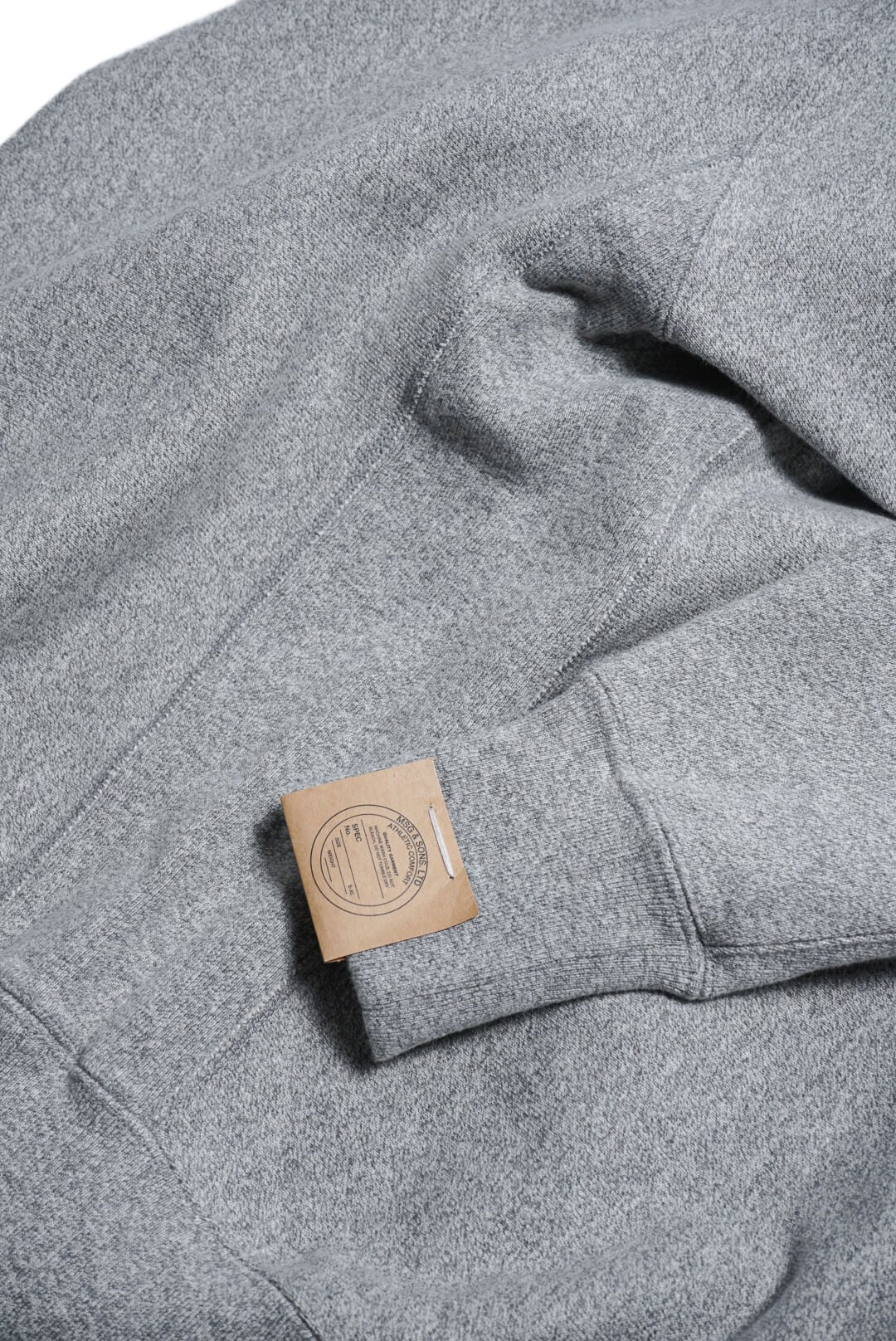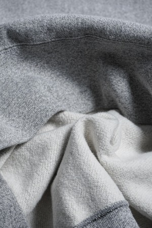 今回、スウェット生地を製作するにあたり、表面を“88/12″ボディ、裏面を米綿100%の起毛仕上げにすることで、レーヨン混による柔らかな質感を持ちながらもほどよいハリコシがあり、型崩れしずらい生地へと編み上げることに6回のテストサンプルを経て成功。